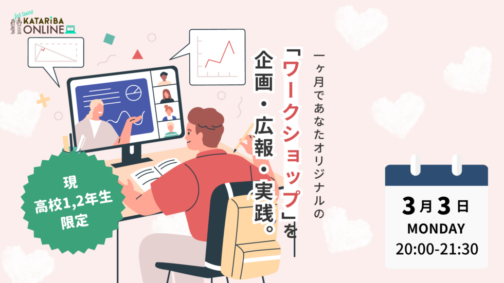 そんなあなたにおススメ。自分の好きなテーマでワークショップの企画・広報・運営にチャレンジできる実践コースです。 1か月間、カタリバスタッフや大学生キャストに相談しながら準備を行い、最終的には60分〜90分程度のワークショップを実践。(ワークショップ実施時間は相談可能) コースに参加する高校生同士でもディスカッションをし、多様な意見やアイデアを得て企画を仕上げます。